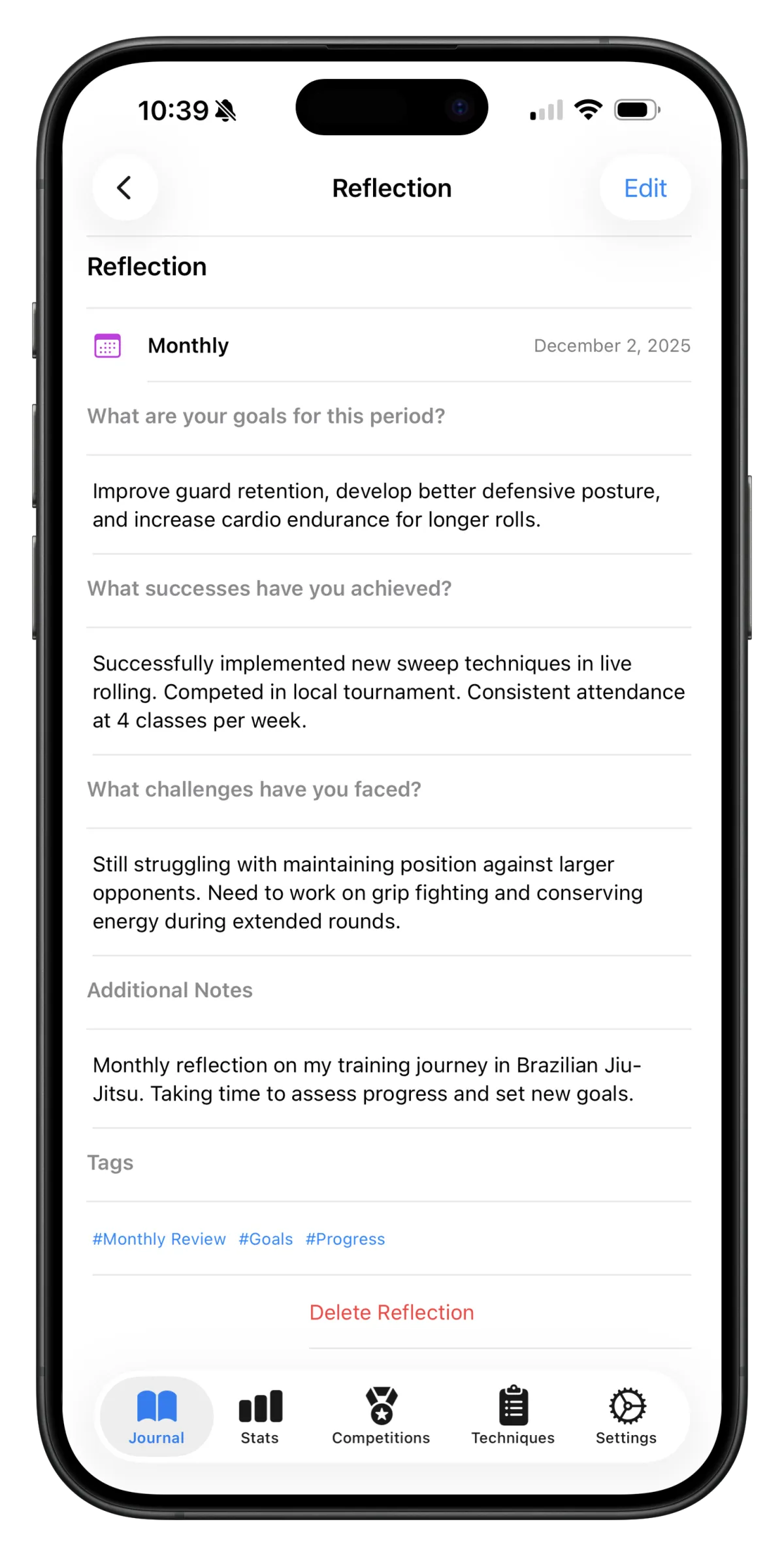Training Sessions (From Classes to Solo Training), Weekly and Monthly Reflection Entries, Promotions, and Guided Self-Discovery Entries