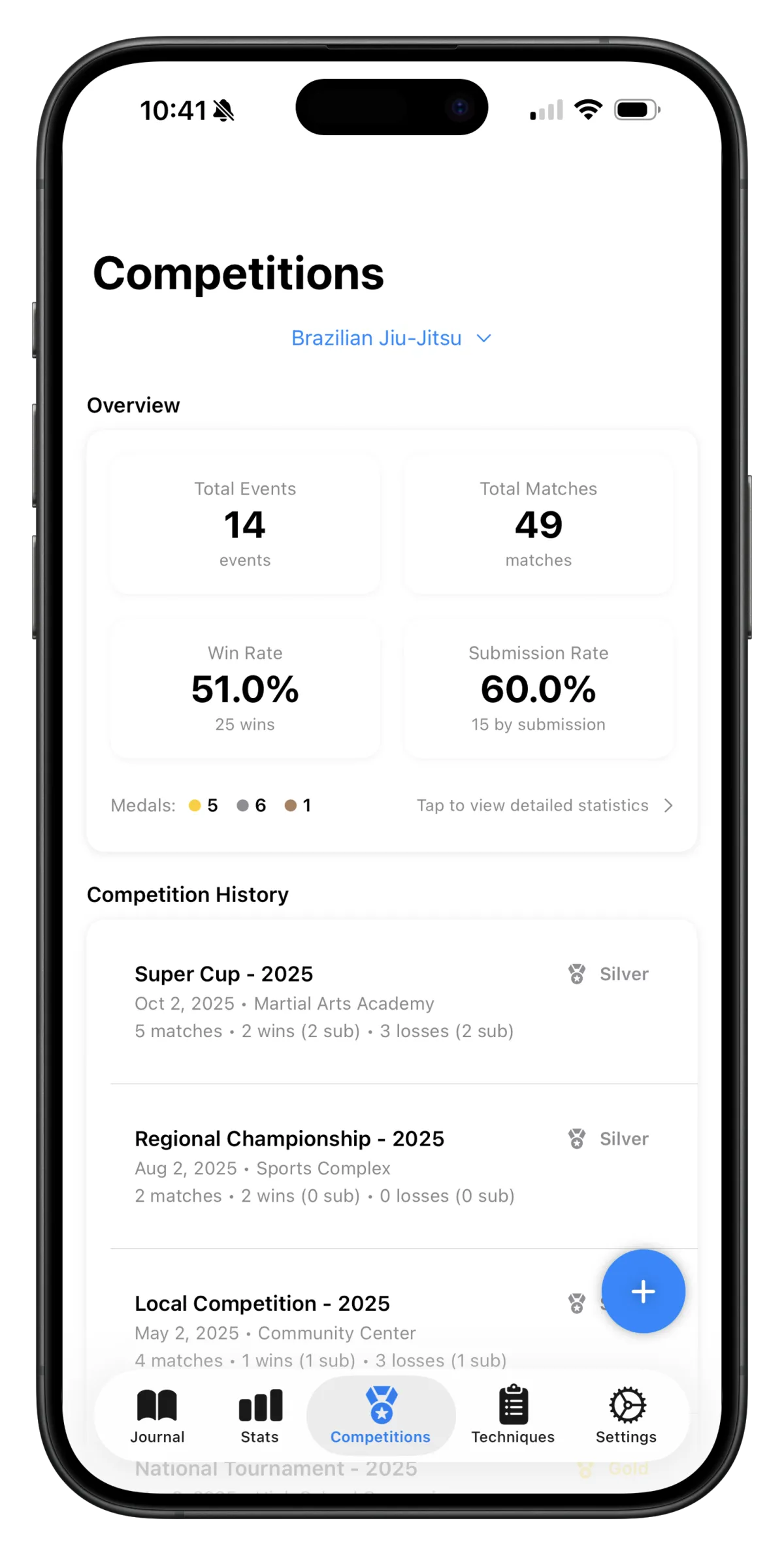 See details about your competitive record at a glance, or drill into the details. Include pictures and links to rulesets, results, or other information you want to keep handy about the competition. Just like the rest of the app's sections, you can track each Martial Art you compete in separately.